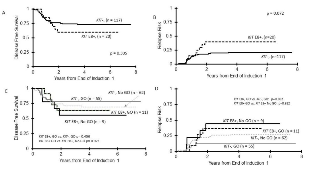 图5 E8突变与CBF-AML临床预后的关系。(A)E8+CBF与KIT野生型患者的DFS比较;(B)E8+CBF与KIT野生型患者的RR比较;(C)E8+与KIT野生型患者采用含GO和不含GO方案治疗时的DFS;(D)E8+与KIT野生型患者采用含GO和不含GO方案治疗时的RR