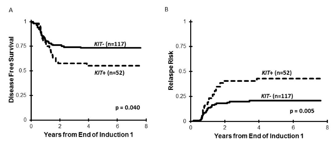 图 3(A)根据KIT突变状态,CBF AML患者的无病生存;(B)根据KIT突变状态,CBF AML患者的复发风险