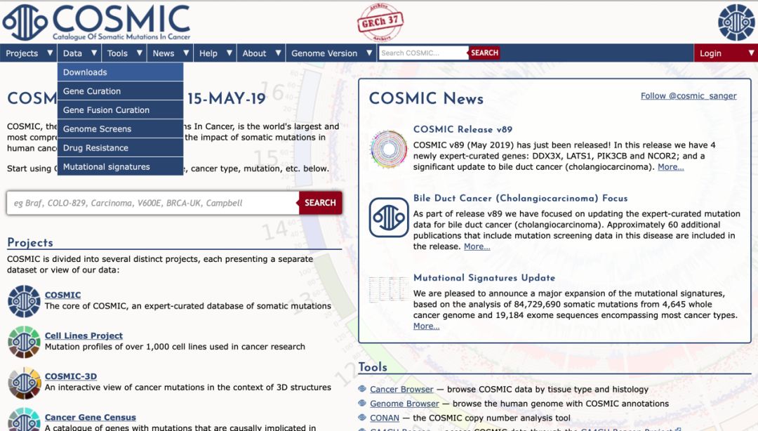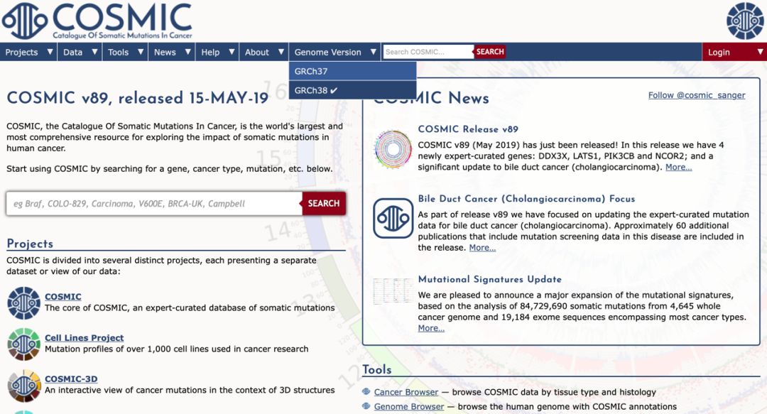 首先获取最新版本的COSMIC数据,这个可以通过使用高校和科研的邮箱注册COSMIC数据库。注册登陆完成后选择你要下载的参考基因组版本。