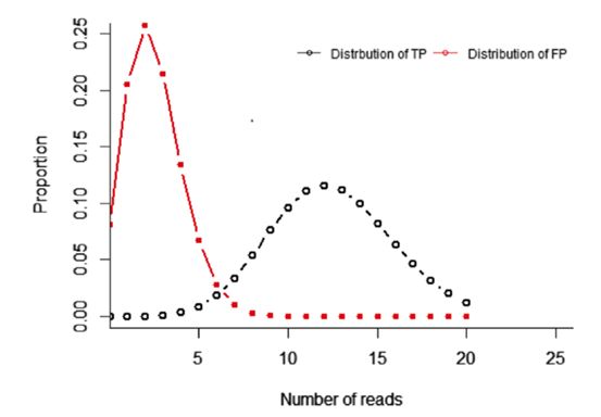 依据测序碱基服从二项式分布(如下图)是测序深度250X下突变频率5%下的检测真阳性和假阳性分布。X轴代表点是发现突变的reads数目,Y轴代表的是对应发现事件的可能性。因此如果设置一个突变为至少5条reads,且突变频率下限设置为5%,则测序深度至少为250X,这也是医学上的最低要求。对于测序panel来讲一般是至少是500X。对于肿瘤组织来讲,考虑到肿瘤纯度的问题,最低平均测序深度要求在1000X以上,而对于线粒体DNA上的突变平均测序深度至少5000X。